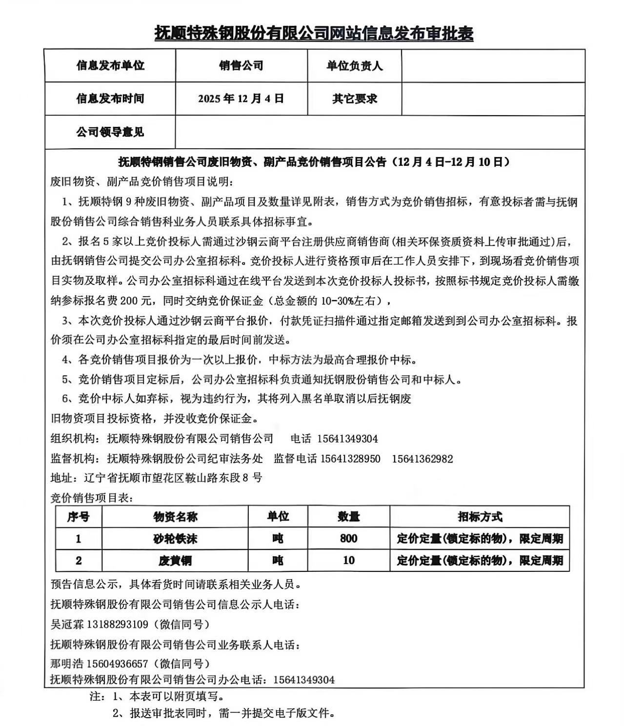 撫順特鋼銷售公司廢舊物資、副產(chǎn)品競價(jià)銷售項(xiàng)目公告(12月4日-12月10日)